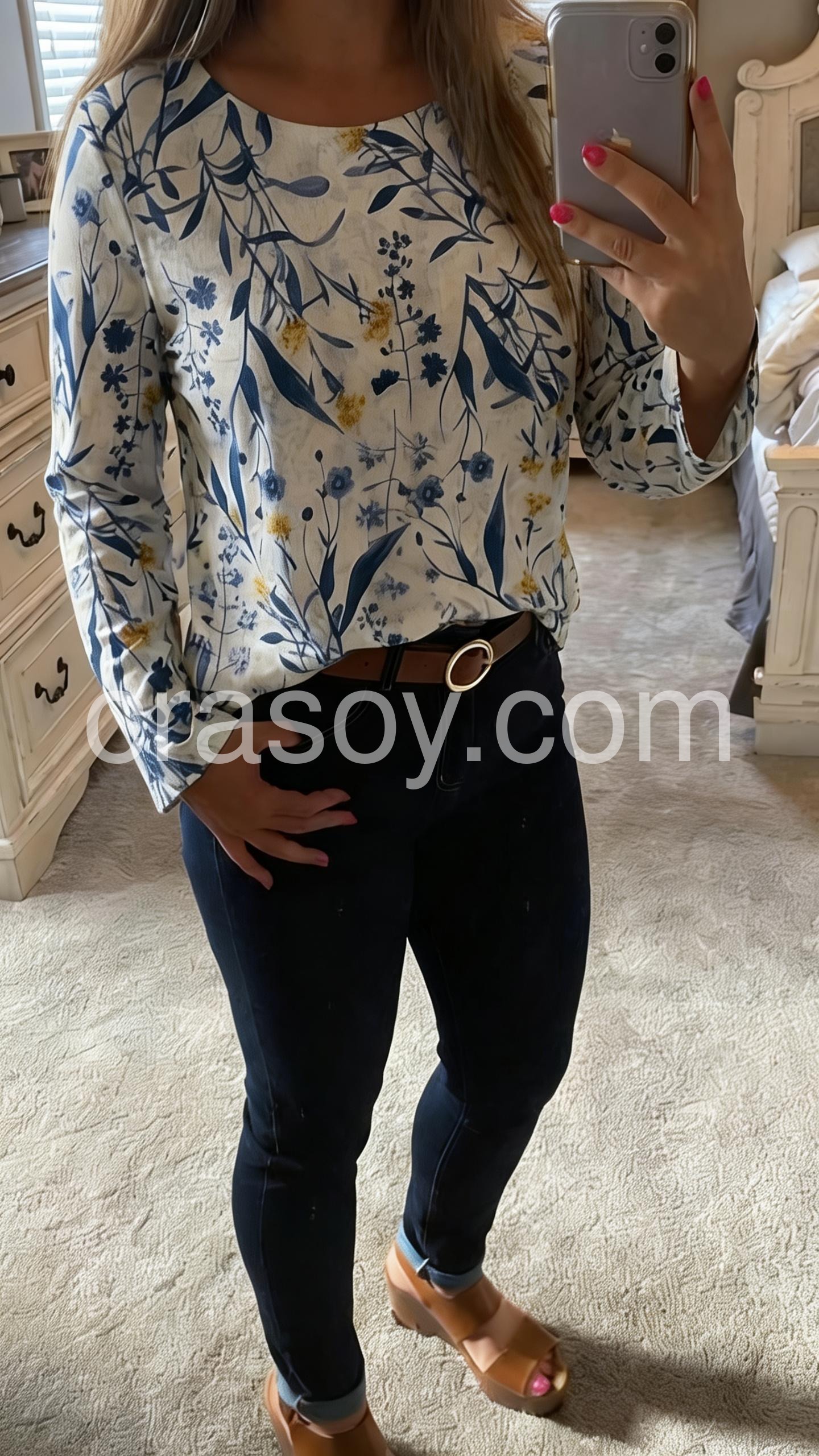 A beautiful spring and summer top! The delicate leaf and flower design makes me so happy. The fabric is breathable, soft, and it hangs beautifully on the shoulders.