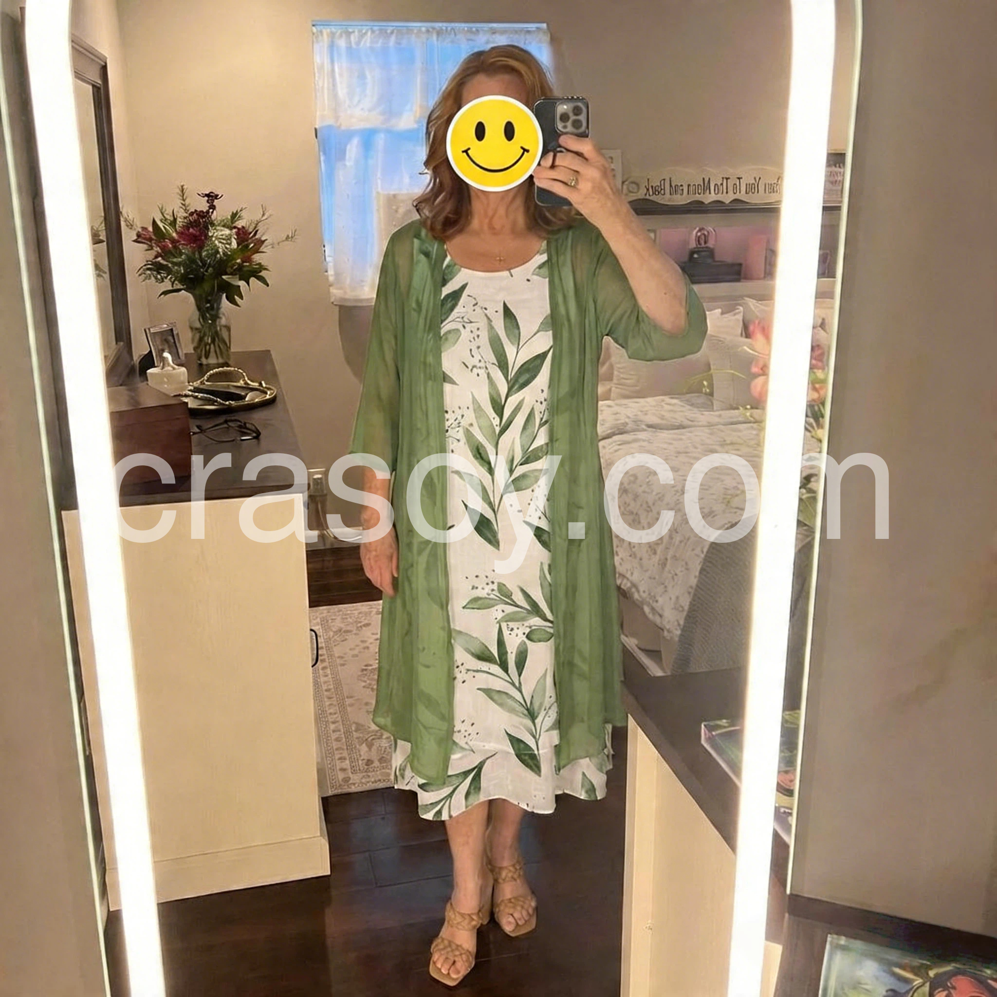 Absolutely love this two piece set! The dress flows beautifully and does not cling to my midsection. The green color is exactly as pictured. It is extremely comfortable for all day wear. Highly recommend.
