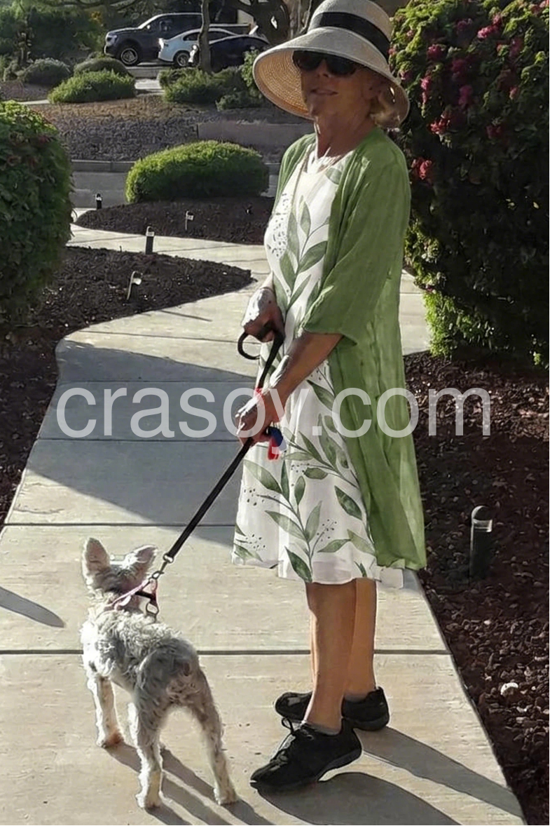 The material is very soft, breathable, and flowy. I was worried the overlay jacket would feel scratchy but it is incredibly soft against the skin. The green leaf design is beautiful and vibrant. I feel wonderful wearing this.