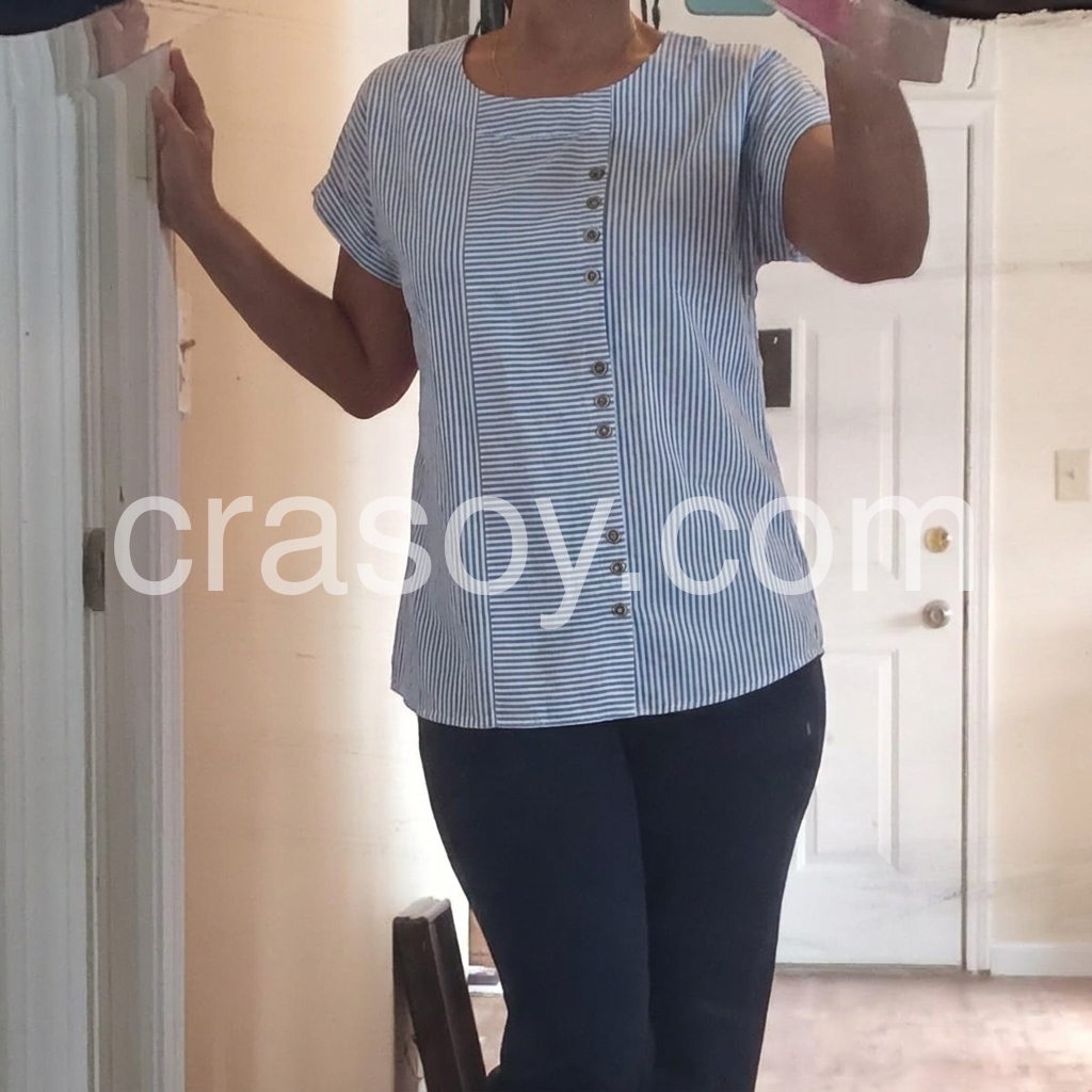 I get compliments every time I wear this shirt. The contrast between the striped panels is very slimming. The fabric feels soft against the skin and it breathes really well. It is a great everyday top that you can easily dress up with some nice jewelry and slacks.