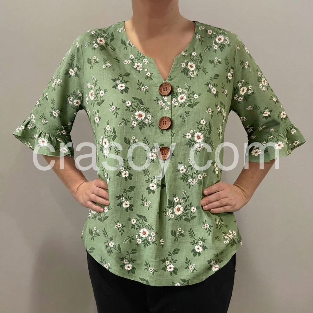 Such a cute, casual boho vibe. The three wooden buttons down the front add a really nice rustic touch. It looks fantastic paired with regular blue jeans. It is lightweight but not see-through at all.
