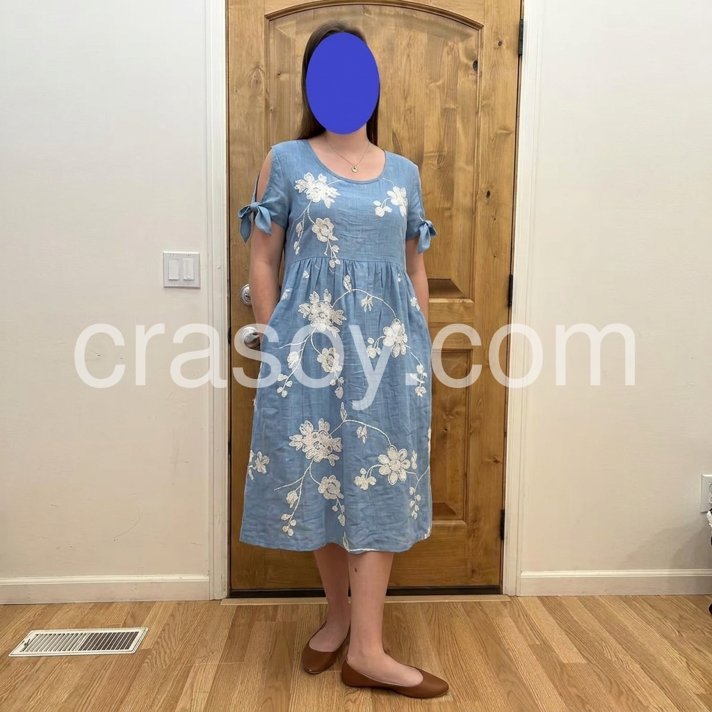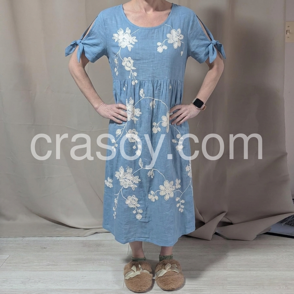 Beautiful, effortless dress. The fabric is breathable which is exactly what I need for Texas summers. The length is great, hitting right above my ankles. The white floral details really pop against the blue.
