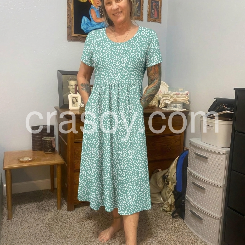 Such a great find! The midi length is perfect for me hitting right below the knee. The short sleeves provide just the right amount of coverage. The fabric is light and breathable, perfect for hot weather but not see-through at all.