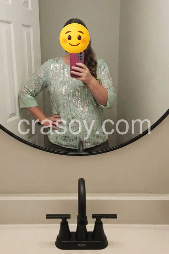 This top is absolutely stunning! The mint green color is so refreshing, and the sequins add just the right amount of sparkle without being overwhelming. Perfect for my upcoming holiday party. Fit is true to size.