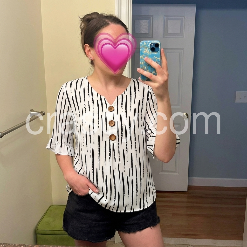 I am absolutely in love with the ruffle sleeves and those cute wooden buttons down the front! It adds such a nice boho touch. The v-neck is flattering and not too deep. Highly recommend for a casual day out.