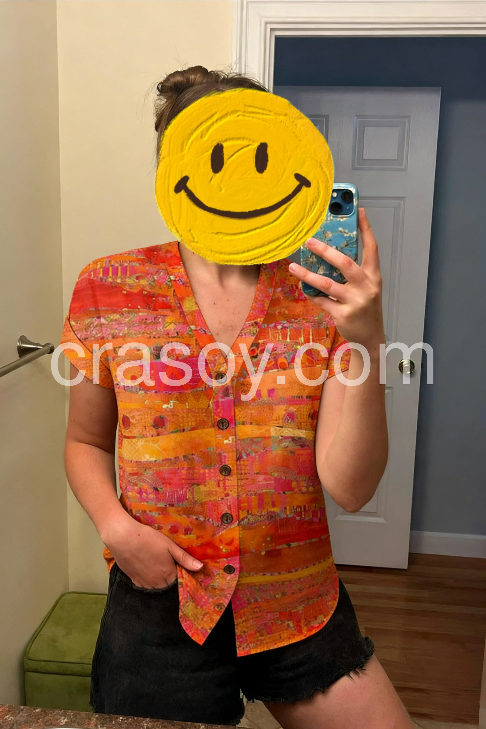 Such a fun and bright top! I bought this for a tropical vacation and it was my favorite piece to wear. It looks great tucked into jeans just like the model shows, but also works well loose over leggings. The buttons are secure and the quality is surprisingly good for the price.